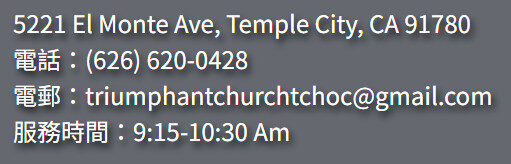 - 主日聚會結束,會有一些茶點,大家請移步到Patio 茶敘,弟兄姊妹可以繼續交通與分享。
